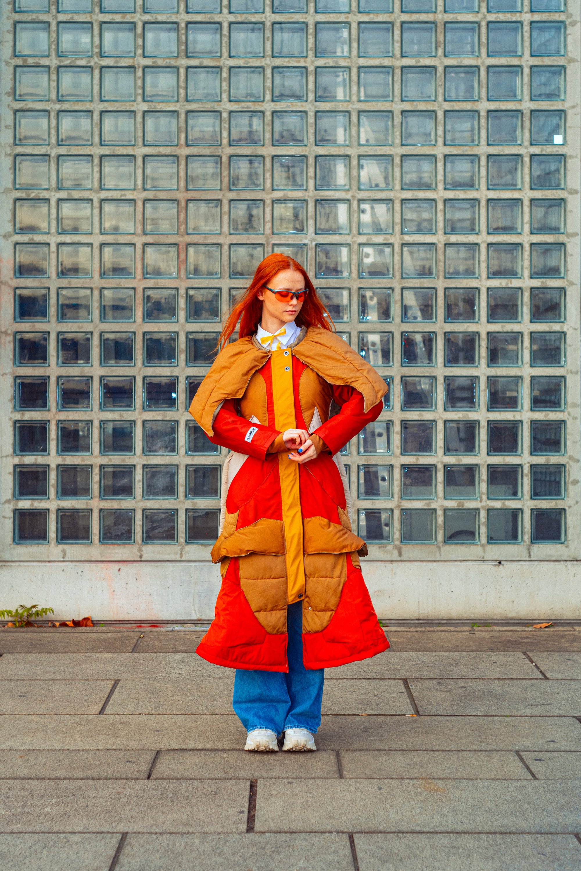 Inspired by autumn landscapes, Autumn blends earthy tones, warm orange accents, and layered textures that echo falling leaves and seasonal change. Every patch, seam, and cut is intentionally placed, creating a bold silhouette full of movement and character.