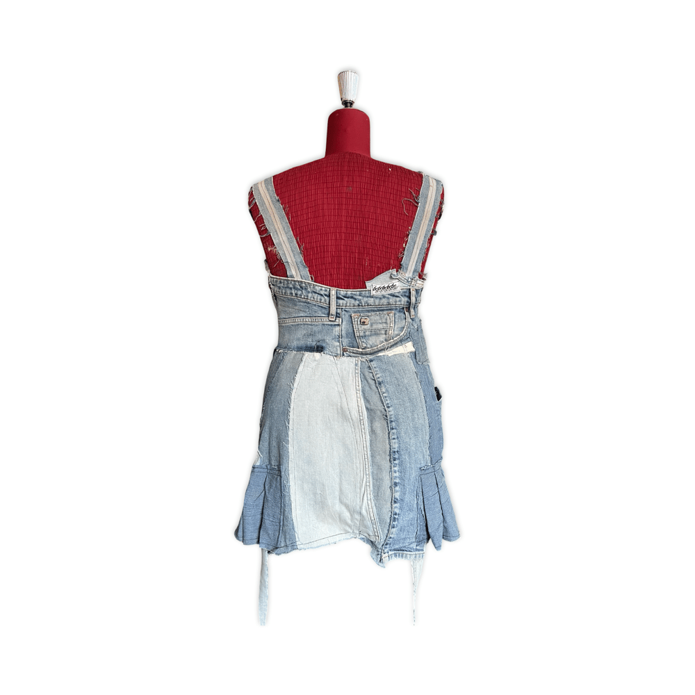One-of-a-kind upcycled pinafore dress handcrafted from multiple reclaimed denim garments and vintage textiles.