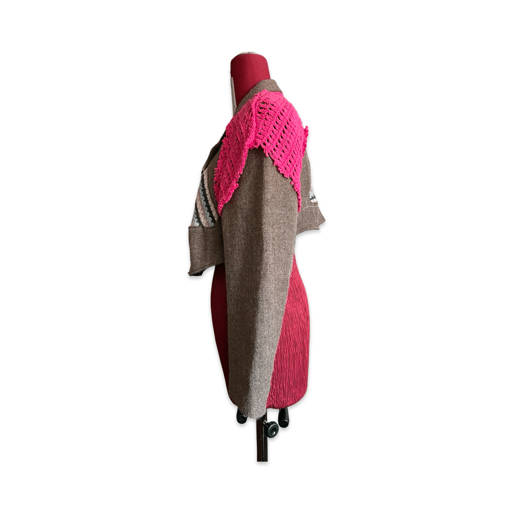 The piece features reconstructed tailoring combined with bold crochet shoulder panels and patchwork details.