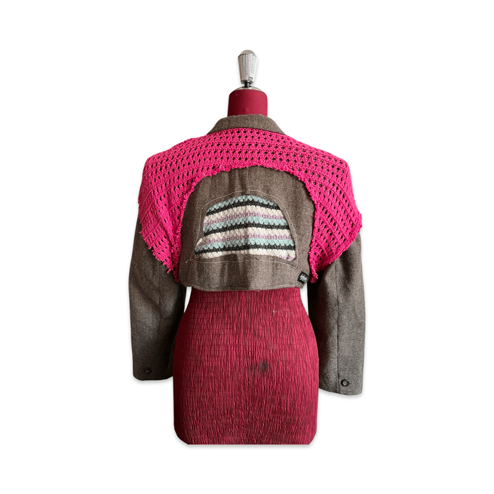 One-of-a-kind cropped jacket created from reclaimed garments and textiles.