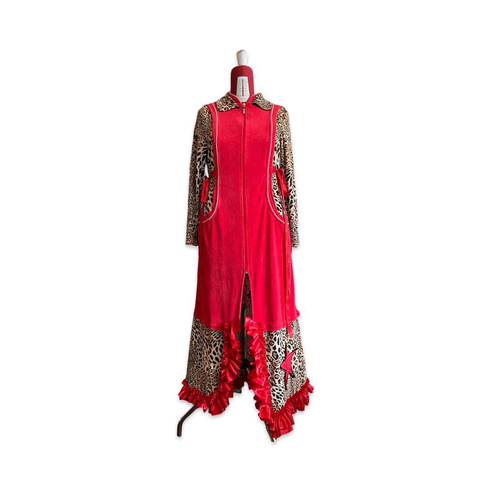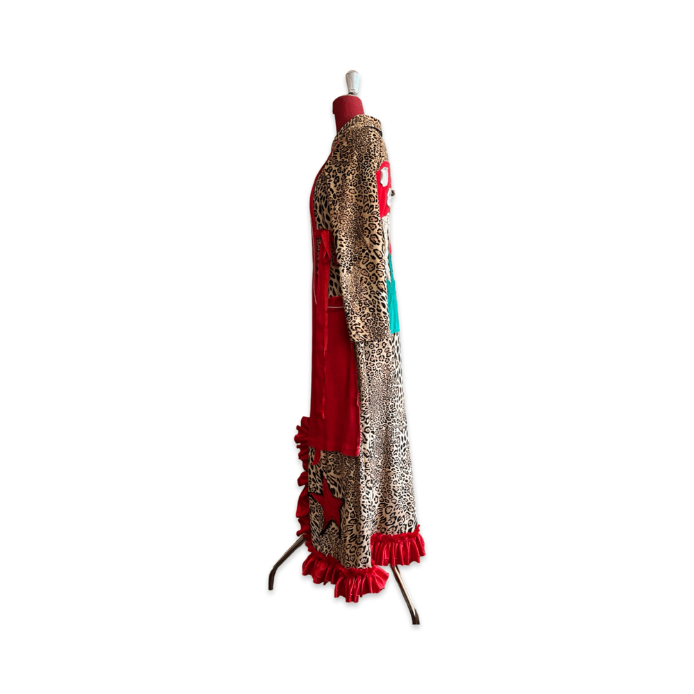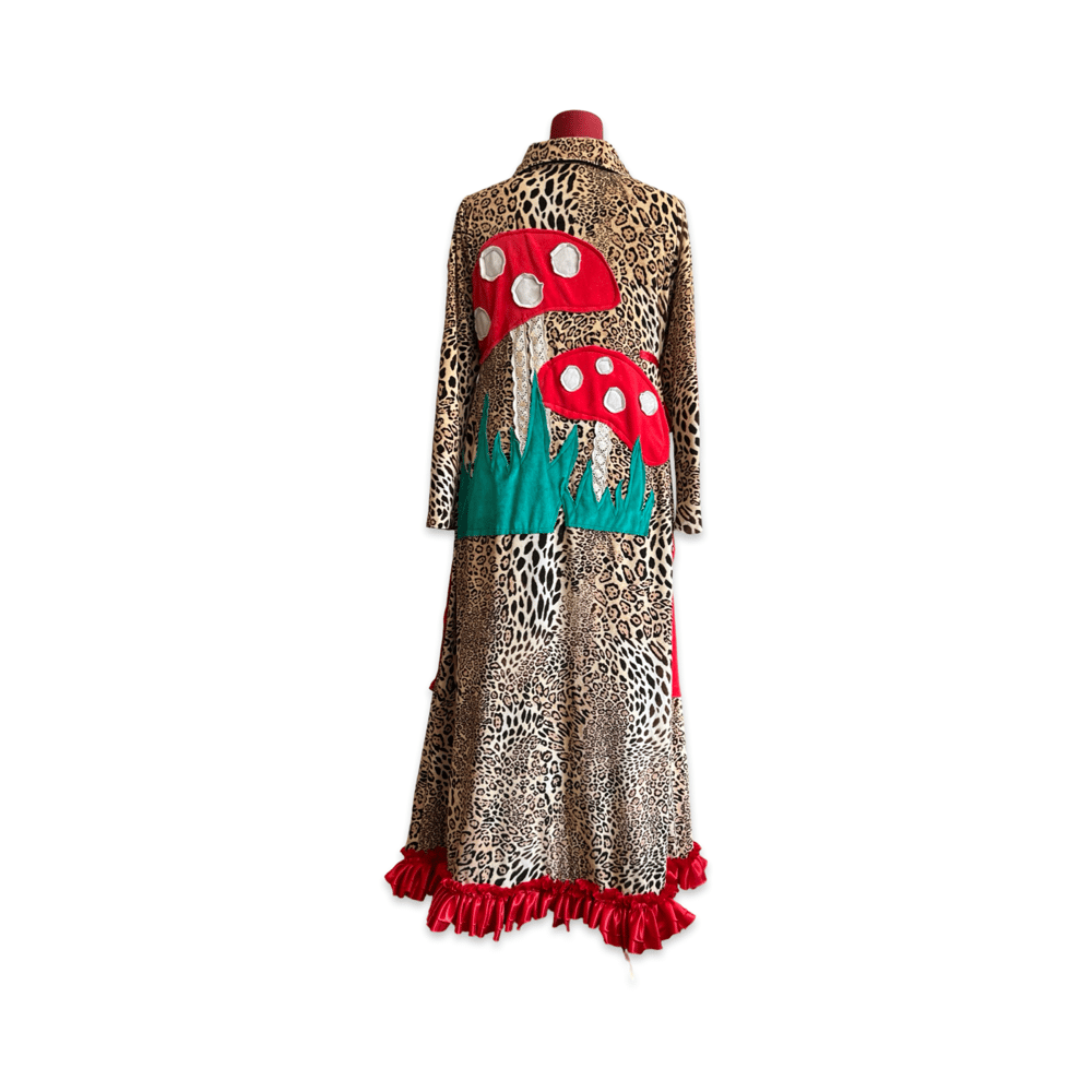This piece combines leopard print fabric with reconstructed red panels and ruffled details. The back features large mushroom appliqués and textile patchwork elements, creating a playful and surreal composition.