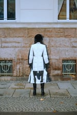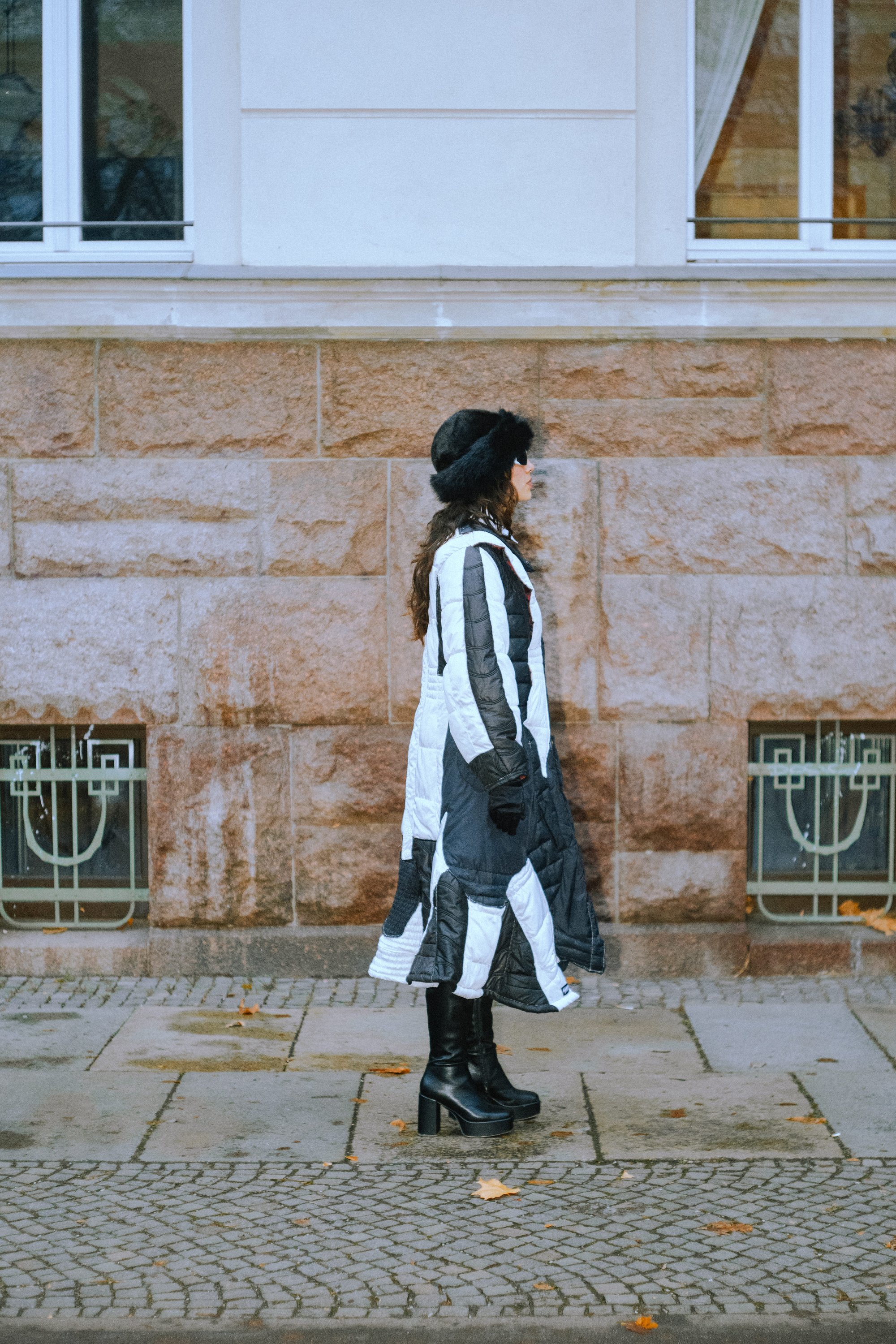 Made from reused winter jackets and insulated materials, this piece reconstructs the classic puffer silhouette into a sculptural, futuristic garment with sharp paneling and high-contrast patchwork. Every section was deconstructed and rebuilt to create a dramatic long A-line shape full of movement and attitude.